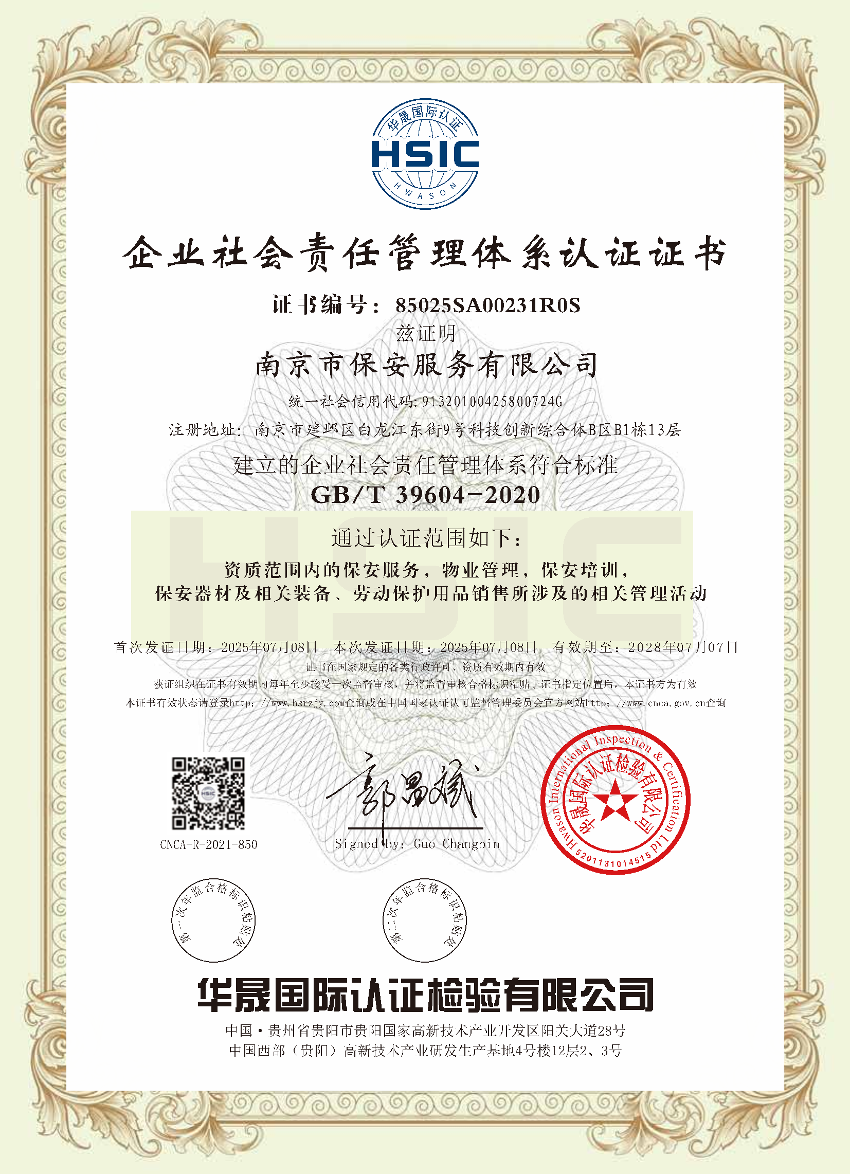 南京市保安服務有限公司(原南京市保安服務總公司)成立于1987年4月,是一個有著悠久安保經營歷史和安保經驗沉淀的大型國有保安企業,現為中國保安協會常務理事單位,江蘇省保安協會常務理事單位,南京市保安協會副會長單位,江蘇省一級保安服務公司。